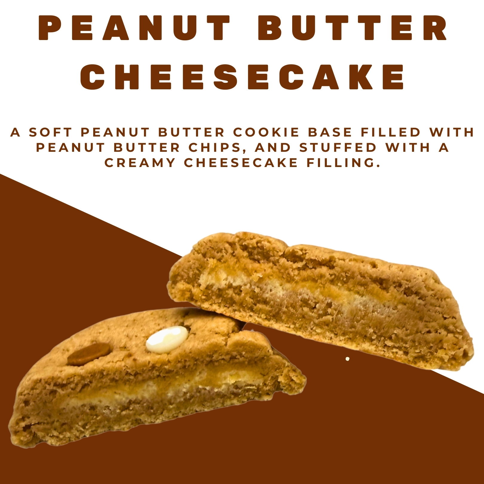soft peanut butter cookie base filled with cream cheese and peanut butter chips, and stuffed with a creamy cheesecake filling